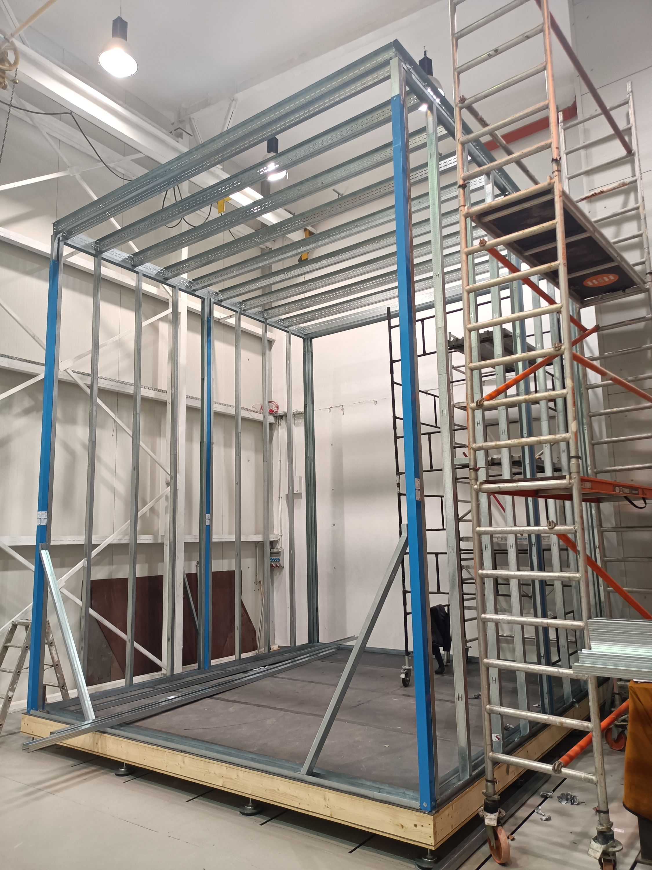 Samonośna konstrukcja w systemie suchej zabudowy posadowiona na wibroizolatorach. Pomieszczenie o podwyższonych standardach izolacyjności akustycznej wg wytycznych Inwestora